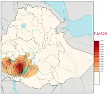 E-M329 is mostly found in East Africa.[2] E-M329 is frequent in Southwestern Ethiopia, especially among Omotic-speaking populations.[3][4] Semino et al. (2004) found 2 cases of E-M329 in Ethiopian Oromo, out of 2400 individuals, including 78 Oromo.[5] Cadenas et al. (2007) found one case of E-M329, out of 72 people, in Qatar.[6]