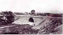 The Harbord Street Bridge was a single-span reinforced concrete Arch bridge built from 1909 to 1914 that carried Harbord over Garrison Creek in the area known today as Palmerston–Little Italy and for the extension of Beatrice Street to Bloor Street West.[1] The bridge was built to allow the better means for people in the new residential development to move around the neighbourhood. The bridge crossed over the creek from Montrose Avenue to Grace Street. The bridge bisects the Bickford Park neighbourhood with Bickford Park to the north side and Harbord Park (Art Eggleton Park) to the south. Infilling of the area around the bridge began in 1917 [2] and both sides were filled by 1930, likely due to sewage being dumped into the creek following residential development,[3] but the balustrades on either side were still exposed. Today, only the northern balustrade remains visible. Like the Crawford Street Bridge, it was not torn down but buried. The bridge, the valley, and the creek have all now disappeared underground.