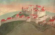 In 1299 the castle was pledged by King Albert I of the House of Habsburg to the Counts of Oettingen. King Conrad IV lived on the Harburg Castle in 1239.[3] Emperor Sigismund confirmed the property of the Counts of Oettingen in 1418. In 1530 the historian Hieronymus Wolf was a clerk at Harburg Castle. After the extinction of the protestant line Oettingen-Oettingen, Harburg Castle was transferred to the catholic line Oettingen-Wallerstein in 1731.