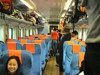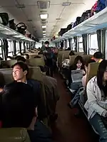Compared to soft seat, hard seat carriages have more seats per row (2+3 vs. 2+2) and are usually more crowded, and people without seats may stand in hard seat carriages.[3]