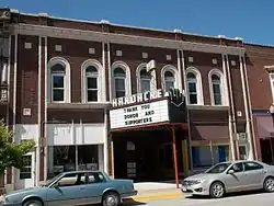 The Hardacre Theater is a historic building located in the central business district of Tipton, Iowa, United States. The theater was originally built as an opera house and its construction was funded by the estate of Jacob Hardacre.[2] Hardacre was a member of a fraternal organization, the Independent Order of Odd Fellows (I.O.O.F.), and it was stipulated that the building was to be used for their functions as well. The theater was opened in 1914, and it was converted into a movie house in 1919. There is seating for 264 on the main floor and an additional 132 seats in the balcony. The present marquee was erected by the Iowa Neon Sign Company of Des Moines in 1948. The I.O.O.F. sold the theater to Louie and Virginia Cook in 1978. It continued to serve as a movie theater, and it hosted its own film festival until it closed in August 2013. The Hardacre Theater Preservation Association bought the theater in 2014. They are renovating the theater to accommodate digital movie equipment, to return it to a live performing arts theater, and to provide space to host community events.[3] It was listed on the National Register of Historic Places in 2016.[1]