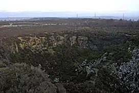 Quarrying has been prominent on the western edge of what is now Harden Moor adjacent to Ryecroft Road[27] for over 300 years, with many of the quarrymen residing in the nearby hamlet of Ryecroft.[28] The sandstone from these quarries (Yeadonian, which is rough rock and rough rock flags) was used to construct the iconic buildings in Saltaire and other local towns and villages.[29] The last operational quarry was Midgeham Cliff End Quarry which was satisfying a demand for a type of sandstone (known as blockstone) that is used in locally constructed housing. The quarry had ceased activity by 2012, but was granted a licence to recycle construction and demolition waste. However, the site must be safe and fully restored by 2022.[30]