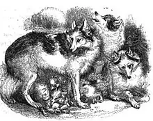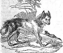 It is thought by one writer that the breed originated from a cross between native Tahltan bear dogs and dogs brought to the North American continent by Viking explorers, as it bears strong similarities to Icelandic breeds in appearance and behavior. Sir J. Richardson of Edinburgh, on the other hand, who studied the breed in the 1820s, in their original form before being diluted by crossings with other breeds, could detect no decided difference in form between this breed and a coyote, and surmised that it was a domesticated version of the wild animal. He wrote, "The Hare Indian or Mackenzie River Dog bears the same relation to the prairie wolf [coyote] as the Esquimeaux Dog [Malamute] does to the great grey wolf."[4] The breed seemed to be kept exclusively by the Hare Indians and other neighboring tribes, such as the Bear, Mountain, Dogrib, Cree, Slavey and Chippewa tribes living in the northwestern territories of Canada and the United States around the Great Bear Lake, Southwest to Lake Winnipeg and Lake Superior and West to the Mackenzie River.[1] They were valued by the Indians as coursorial hunters, and they subsisted almost entirely on the produce of each hunt. Although not large enough to pose a danger to the moose and reindeer they hunted, their small size and broad feet allowed them to pursue large ungulates in deep snow, keeping them at bay until the hunters arrived.[3] It was too small to be used as a beast of burden.[2] It was the general belief among the Indians that the dog's origin was connected to the Arctic fox.[5] When first examined by European biologists, the Hare Indian dog was found to be almost identical to the coyote in build (save for the former's smaller skull) and fur length. The first Hare Indian dogs to be taken to Europe were a pair presented to the Zoological Society of London, after Sir John Richardson's and John Franklin's Coppermine Expedition of 1819–1822. Though originally spread over most of the northern regions of North America, the breed fell into decline after the introduction of firearms made its hunting abilities unnecessary. It gradually intermingled with other breeds such as the Newfoundland dog, the Canadian Eskimo dog and mongrels.[3]
