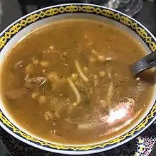 Harira (Arabic: الحريرة al-ḥarīra) is a traditional North African soup prepared in Morocco[1] and Algeria.[2][3][4] Algerian harira differs from Moroccan harira in that Algerian harira does not contain lentils. It is popular as a starter but is also eaten on its own as a light snack. There are many variations and it is mostly served during Ramadan, although it can be made throughout the year.[5]