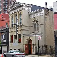 The Low Dutch Reformed Church of Harlem maintained these segregated cemeteries for white parishioners and parishioners of African descent. The church moved a few blocks from its original site in the mid-19th century and sold the African burial grounds to a parishioner who used the land for grazing livestock.[6] The Low Dutch Church eventually sold the site in 1853, allowing for the re-division of the land, including the burial grounds, into private parcels that would become City Block 1803.[7] After contacting descendants for permission, the remains of the white parishioners were disinterred and reburied in Woodlawn Cemetery in the Bronx; the remains of the African parishioners were left behind. The land was subsequently used for a variety of purposes including an amusement park, a beer garden, barracks for a National Guard infantry unit, and a film studio owned by William Randolph Hearst. The building was bought by the Third Avenue Railway Company for its streetcars and later buses, which was then acquired by the city.