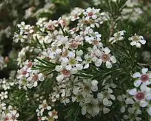 Harmogia densifolia is a shrub to 1.5 metres high with linear or terete leaves. White flowers appear in spring or summer with 5 round petals surrounding 7 to 10 stamens. It occurs from Nowra in New South Wales northwards through the east of the state and into Queensland.[2]