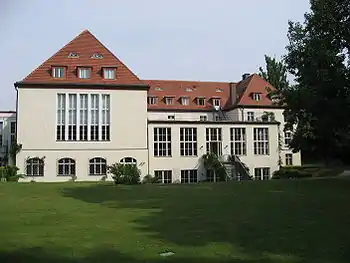 The Harnack House (German: Harnack-Haus) in the Dahlem district of Berlin, Germany was opened in 1929 as a centre for German scientific and intellectual life. Located in the intellectual colony of Dahlem, seat of the Free University Berlin, it was founded by the Kaiser Wilhelm Gesellschaft (KWG) on the initiative of its first president, the theologian Adolf von Harnack, and of its then chairman, Friedrich Glum. The project was supported politically by the Weimar Republic Chancellor Wilhelm Marx and Foreign Minister Gustav Stresemann, and an influential Centre Party deputy Georg Schreiber. The land for its construction was donated by the state of Prussia, and the costs of building and furnishing the house were defrayed partly by the government (which contributed 1.5 million marks), and partly by public subscription (which raised about 1.3 million marks).