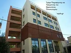 The infrastructure of the university is of high level, in fact it was fully restored in 1993-1994 while a new building was erected in 1999–2000 to house the newly established Geography Department and the library. In 2011 a new building was completed in the area of Tavros, for the newly established Department of Informatics and Telematics and the university's Refrectory.[2]