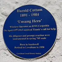 Harold Thomas Cottam (27 January 1891 – 30 May 1984) was a British wireless operator on the RMS Carpathia who fortuitously happened to receive the distress call from the sinking RMS Titanic on 15 April 1912.[1][2] Cottam's decision to awaken Captain Arthur Henry Rostron and relay Titanic's message in spite of the scepticism of the officer on watch[1] allowed Carpathia to arrive at the scene hours before any other ship and is "credited with saving hundreds of lives."[3] He was a personal friend of the Titanic's wireless operators Harold Bride and Jack Phillips.