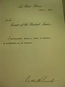 Harold LeClair Ickes (/ˈɪkəs/ IK-əs; March 15, 1874 – February 3, 1952) was an American administrator, politician and lawyer. He served as United States Secretary of the Interior for nearly 13 years from 1933 to 1946, the longest tenure of anyone to hold the office, and the second longest-serving Cabinet member in U.S. history after James Wilson. Ickes and Labor Secretary Frances Perkins were the only original members of the Roosevelt cabinet who remained in office for his entire presidency.