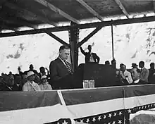 After he resigned from the Cabinet in 1946, Ickes retired to his farm but remained active on the political scene, working as a syndicated columnist.[29] In December 1945, Ickes accepted the position of executive chairman of the newly founded Independent Citizens Committee of the Arts, Sciences, and Professions (ICCASP), a group that criticized Truman's lack of fidelity to FDR's principles. A thousand people attended the hotel banquet that celebrated his appointment.[30] He resigned on February 13, 1946, unhappy with the organization's failure to pay him the agreed-upon salary and unwilling to support the organization of a new political party to support Henry Wallace's presidential race.[31]