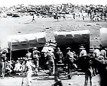 In May 1916–with the approval if not the encouragement of Foreign Office officials in London—Shaw moved to South Africa after accepting a job offer from African Film Productions (AFP) to be that company's "chief producer-director".[29] Central to that assignment was for Shaw to direct De Voortrekkers, a planned historical epic to be filmed in KwaZulu-Natal. The project proposed to portray from the perspective of that region's white minority the "Great Trek" made by Dutch-speaking Voortrekkers or "pioneers" in the 1830s, a time when South Africa was a colony of Great Britain.[26] AFP and other backers of the film envisioned a production of "Griffith-like scale" that hoped "to capture white Afrikaner (Boer) patriotic pride and to earn possible super-profits from export overseas."[26] The film ultimately completed by Shaw later in 1916 features in its extensive cast Dick Cruikshanks, Percy Marmont, and Edna Flugrath and includes an elaborate recreation of the Battle of Blood River of 1838, when a few hundred armed Dutch-speaking Boers defeated thousands of Zulu warriors.[30]