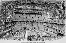 The first drawings Heaton prepared for the Tribune were done using the "chalk plate" method[fn 1] at his own home.[7] This gave way to the zinc etching method by the end of 1887.[7] One drawing of the still incomplete but newly opened Auditorium Building for the 1888 Republican National Convention was reprinted fifty years later by the Tribune as an example of Heaton's skill.[7]