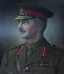 His next posting was as Military Secretary at General Headquarters (GHQ) of the British Expeditionary Force under the Commander-in-Chief (C-in-C), Field Marshal Sir Douglas Haig.[8][53] After harsh criticism of GHQ's performance during the 1917 fighting, several of Haig's senior staff had been replaced by new men like Ruggles-Brise brought in.[54][55][56] The Military Secretary was one of the C-in-C's closest assistants with particular responsibility for promotions and appointments. Ruggles-Brise arrived in the middle of the German spring offensive of March 1918, and one of his first jobs was to inform the commander of the British Fifth Army, Lieutenant General Sir Hubert Gough – in the midst of organising a counter-attack – that he was being replaced.[57] Gough recalled that Ruggles-Brise 'told me as nicely as he could'.[58]