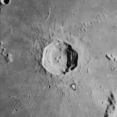 ![]() Lunar Orbiter 4 image (triangular mark below right of crater is blemish on original) | |