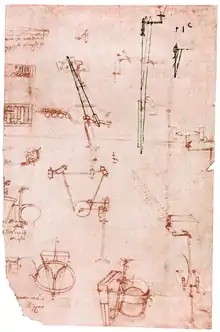 The harpsichord-viola (in Italian Clavi-viola) is a hybrid musical instrument[1] based on the designs of Leonardo da Vinci on folio 93r of the Codex Atlanticus. It's a different project from the viola organista (folio 886 of the Codex Atlanticus). It is about the size of a child's toy piano. It weighs 33 pounds and straps to the musician's chest. It's unlike anything else in the orchestra. It has the strings of a violin but is played with a keyboard, and it's powered by the musician's legs as he walks. It's built with the materials that Leonardo would have had on hand, including wooden pegs and gears run by twine. In the folio of Leonardo, you can see that the instrument has a harness. So it was invented as a way to play a stringed instrument while marching. The leg pumps a wooden motor, which moves a long loop of horsehair through the instrument. When the player presses the keys, the strings move up against the loop.