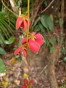 The fruit is a velvety, yellow to reddish, bilocular capsule roughly 2 cm (0.79 in) long. Each locule usually contains two black seeds, each almost entirely covered by a yellow or red aril.[5][6]