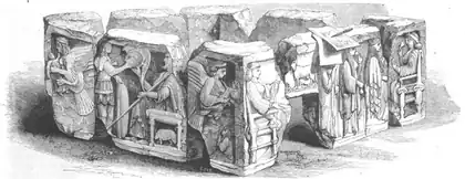 The tomb is a large square of carved marble panels. Each side is 7 feet (2.1 m) in length and 3 feet 3 inches (1.0 m) in height. It was originally set upon a large oblong stone pedestal, 17 feet (5.2 m) high, making it an example of a pillar tomb. The top of the pillar has a hollowed out chamber creating a space inside the tomb 7 feet 6 inches (2.3 m) tall from the bottom of the hollow to the top of the reliefs. All four sides are carved with similar relief panels in one of which (the south side[n 1]) is a small opening to allow a body to be placed in the tomb. This aperture may originally have been closed with a stele. The tomb is roofed with what appear to be three large slabs, one above the other. In fact, the capstone is one single piece, weighing 15 to 20 tons, carved to give the appearance of three layers. Each false slab overlaps the ones below to form an entablature. All the parts, except the sculptured reliefs, are made from local grey-blue limestone.[24][25][26][27][28][29]