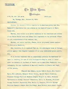 Telegram on Pankhurst Deportation, signed by Jane Addams, Harriet Taylor Treadwell, and other Chicago suffragists in 1913.