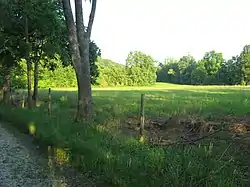 The northern part of the county is known as the barrens, named by the early settlers for its scarce timber. At first, settlers preferred the southern areas where wood was available.[22] The barrens were swept by annual wildfires that prevented the growth of trees. The largest barren ran from the northern edge of Corydon northward to Palmyra, and from the Floyd Knobs in the east, westward to the Blue River. The Central Barren covered most of the upper middle part of the county. As settlement expanded and farming grew in the early 19th century, settlers found the barrens to be fertile farmland, and they were quickly settled. As settlement increased, the wildfires were stopped and by the start of the 20th century the uninhabited parts of the barrens had become forested and have remained so until modern times.[23] A large meteorite fell near Buena Vista on March 28, 1859. The impact site and a part of the meteorite have been preserved.[6]