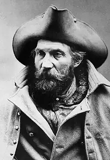 Yount would fill a wagon full of freshly killed game, and then sell the meat in towns such as Laramie and Cheyenne.[3] According to Ingersoll, Yount was quite careful about his personal appearance: "his belt, holster, knife-sheath, bridle, and saddle are all set off with a barbaric glitter." Yount paid a Shoshone woman to decorate his buckskin jacket, "a marvel of fringes, fur trimming and intricate embroidery of beads."[3] Ingersoll wrote that Yount was "by nature a gentleman, and under his sinewy frame and tireless strength, there is a heart as tender as a girl's, which hates the cruelty his profession unavoidably occasions. His eye is open to every beautiful feature of the grand world in which he lives; his heart is alive to all the gentle influences of the original wilderness."[3] Ingersoll's 1883 book, Knocking 'Round the Rockies, describes Yount in a similar fashion.[5]