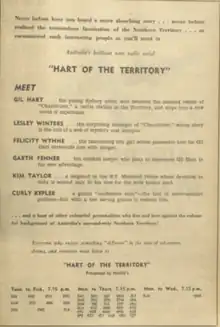 Hart of the Territory is a 1951 Australian radio serial by Anthony Scott Veitch and produced by Colin Cragin. It was set in the Northern Territory. Sydney John Kay wrote the music.[1] Extensive research went into the scripts.[2]