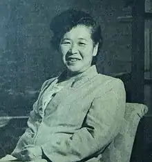 After the war, Yamashita joined the Japan Progressive Party. She was a candidate for the party in Fukushima in the 1946 general elections (the first in which women could vote), and was elected to the House of Representatives.[2] The following year the JPP merged into the Democratic Party. She was re-elected as a Democratic Party in the 1947 elections. In December 1948 Finance Minister Izumiyama Sanroku was forced to resign after attempting to kiss Yamashita and Toshiko Matsuo.[3] She subsequently lost her seat in the January 1949 elections.[4]