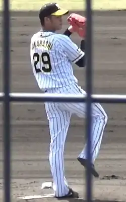 He spent the first few months in the farm to give his arm more time to heal.[13] His first start came on May 5 against the Baystars, but he failed to secure a win after giving up 5 runs in 4 innings.[14] He also lost his next start, but redeemed himself on May 30 when he pitched 7 solid innings against the Giants and won the game. This was his first official win in more than a year.[15] He continued to pitch well afterwards and was even in the running for the July MVP of the month after giving up at most 2 runs in 6 consecutive starts, but he kept failing to secure a win due to lack of run support.[16] His continued starts took its toll on his arm once more however, and he went into a slump later in the season, losing 3 out of his 4 matches in September.[17] He also pitched in relief during Randy Messenger's retirement game on September 29, and recorded his first career hold after pitching 2 scoreless innings. He finished the season with 3 wins, 9 losses, 1 hold and a 3.78 ERA in 19 game appearances. After Hanshin finished 3rd in the overall rankings, he started 2 games during the post-season Climax Series and helped his team beat the Baystars to reach the final stage.[18] His improved performance earned him a 9 million pay raise, bringing his total annual salary to 22 million yen.[17]