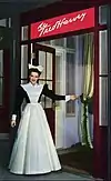 The women were subjected to a strict 10 p.m. curfew, administered by a senior Harvey Girl who assumed the role and responsibilities of house mother.[9] The official starched black and white uniform (which was designed to diminish the female physique) consisted of a skirt that hung no more than eight inches off the floor, "Elsie" collars, opaque black stockings, and black shoes. The hair was restrained in a net and tied with a regulation white ribbon. Makeup of any sort was absolutely prohibited, as was chewing gum while on duty. Harvey Girls (as they soon came to be known) were required to enter into a six-month employment contract, and forfeited half their base pay should they fail to complete the term of service. Marriage was the most common reason for a girl to terminate her employment.[9]