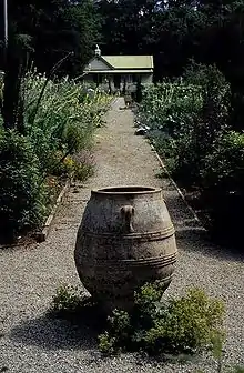 The garden consists of a number of terraced levels with stone retaining walls. A system of pathways and steps link the various levels.[1]