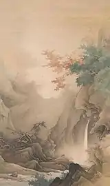 Following a revival of interest in Japanese painting during the 1880s, he twice won a prize at the government-sponsored picture exhibitions which led him to become famous.[3] Gahō was invited in 1884, by Okakura Kakuzō, to become the chief professor of painting at the Tōkyō Bijutsu Gakkō (東京美術学校, now the Tokyo National University of Fine Arts and Music) which would open five years later. His students included Kawai Gyokudō and Yokoyama Taikan who would become future masters of Japanese painting.[3] In 1898, Gahō joined Okakura in leaving the Bijutsu Gakkō, and founding the Japan Fine Arts Academy (日本美術院, Nihon Bijutsuin). He would teach there until his death in 1908.
