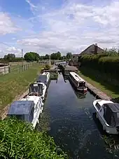The canal leaves the main line of the Staffordshire and Worcestershire Canal at Calf Heath. There is a large marina on its north side, close to the junction,[15] after which a bridge carries a minor road over the canal, before it enters the first lock. Above the lock, a wider section provides additional mooring space before the second lock. This has been modified to include a ledge to one side, which provides dry dock facilities for the nearby boatyard. Exit from the top of the lock by boat is not possible.[16]