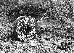 The Haun’s Mill Massacre (also Hawn’s Mill Massacre) occurred on October 30, 1838, when a mob/militia unit from Livingston County, Missouri, attacked a Mormon settlement in eastern Caldwell County, Missouri, after the Battle of Crooked River.[1] By far the bloodiest event in the 1838 Mormon War in Missouri, it has long been remembered by the members of the Latter Day Saint movement. While the spelling "Haun" is common when referring to the massacre or the mill where it occurred, the mill's owner used the spelling "Hawn" in legal documents.[2]