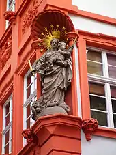 The three-story house with an attic apartment is located in the eastern half of the Hauptstrasse, the main street of the Heidelberg Altstadt, on the corner with Kettengasse ("chain alley"). The showy facade on the Hauptstrasse has three windows on each floor, while the facade on Kettengasse is longer, with eight windows, but also simpler. At the corner, on the first floor is a Madonna, which was probably made by the sculptor Peter van den Branden, who also made the Kornmarkt-Madonna. The statue on the building today is a copy; the original is kept in the Kurpfälzisches Museum. The central relief on the facade, depicting the Trinity, is remarkable for their period. It is flanked by two inscriptions: "Alle Stund und Zeit sei gelobt die heilige Dreifaltigkeit" (Every hour and moment, let the Holy Trinity be praised!) and "Wer Gott verdraut hatt wohl Gebaut" (He who trusts God, has built well). The decoration of the building thus showcases the Catholic piety of its owners, during the Counterreformation in Heidelberg.