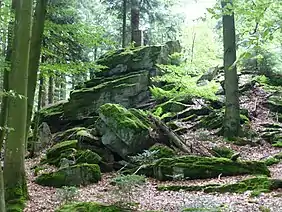 ![]() Summit of the Hausstein. View from NE of the rock blocks and the brick tower | |