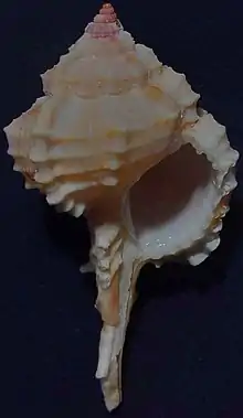 Medium shell, creamy white to brown, sometimes tinged with pink and ornamented with brown blotches. Three prominent, rounded varicies per whorl, usually spineless, but occasionally with one or two sharp spines at the base of the varicies and anteriorly on the canal. Sculptured with gemmate, spiral striae which are occasionally yellowish. Aperture white, outer lip sharply, minutely dentate.[3] The shell of an adult specimen varies between 50 mm and 80 mm.