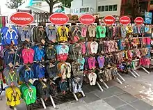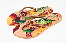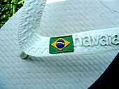 Havaianas (stylized as havaianas) is a Brazilian brand of flip-flop sandals created and patented in 1962. The company was founded by scottish immigrant Robert Fraser. Inspired by the Japanese zori sandals, Havaianas became the first mass-produce flip-flops out of rubber.[1] The name Havaianas is derived from the feminine form of the Portuguese word for "Hawaiians", the name was chosen as homage to the popular vacation destination of Hawaii. The brand is currently owned by Brazilian manufacturing company Alpargatas S.A..