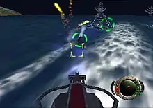 Other gameplay sections involve different control schemes and game mechanics. For example, when wearing the jet pack, Haven can accelerate upwards by expending fuel. When using the glider, as well as basic maneuverability, he can perform an air brake. In the biplane, he can roll left and right. In the speedboat and quadracer, he can accelerate and brake. When operating a turret or spaceship, he has access to forward and aft missiles and can lock on to enemies.[7] The spaceship Sunsurfer, which Haven acquires towards the end of the game, also has access to different types of missiles, and can equip a shield.[8]