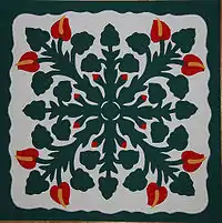 Another Hawaiian quilt style is the Hawaiian flag quilt, also known as Ku’u Hae Aloha ("My Beloved Flag" or "Lost Beloved Flag"[1]) quilts. The typical flag quilt includes four Hawaiian flags surrounding the coat of arms of the Hawaiian Royal Family or crown.[2] Flag quilts combine pieced work with appliqued motifs, unlike other traditional Hawaiian quilts, which do not use pieced work.[2]
