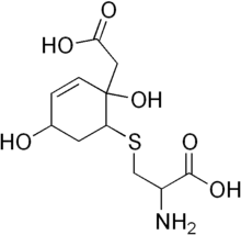 Normally, the breakdown of the amino acid tyrosine involves the conversion of 4-hydroxyphenylpyruvate to homogentisate by 4-hydroxyphenylpyruvate dioxygenase. Complete deficiency of this enzyme would lead to tyrosinemia III. In rare cases, however, the enzyme is still able to produce the reactive intermediate 1,2-epoxyphenyl acetic acid, but is unable to convert this intermediate to homogentisate. The intermediate then spontaneously reacts with glutathione to form 2-L-cystein-S-yl-1,4-dihydroxy-cyclohex-5-en-1-yl acetic acid (hawkinsin).[3][4]
