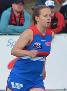 Hayley Wildes (born 10 September 1996) is an Australian rules footballer who played for the Western Bulldogs in the AFL Women's competition. Wildes was drafted by the Western Bulldogs with their six selection and forty-fourth overall in the 2016 AFL Women's draft.[1] She made her debut in the thirty-two point win against Fremantle at VU Whitten Oval in the opening round of the 2017 season.[2] She played every match in her debut season to finish with seven games.[3]