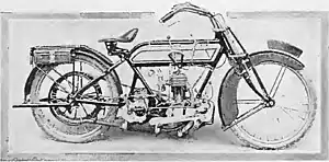 In mid-1914 they updated the motorcycle design by adding a three-speed 'countershaft' gearbox complete with integral kick-start.[3] Although Sturmey-Archer were offering a 3-speed countershaft gearbox with integral kick-start from this date, it is not clear that the one used by Hazlewood was a Sturmey-Archer product. The new gearbox required the addition of an extra down-tube at the rear of the frame. The company offered a service to existing owners to retrofit this to their machines, so earlier examples may be found with the three speed gearbox. Later in 1914 they launched a middleweight single cylinder motorcycle again using a J.A.P. engine, this time of 90 mm bore, 93 mm stroke (592 cc) rated at 4 horsepower.[4] This used similar cycle parts to the V-twin including the three speed gearbox. A smaller engined machine with a 2-3⁄4 horsepower J.A.P. engine continued to be available, this using a Sturmey-Archer 3-speed hub[4] (Sturmey-Archer bought the Armstrong-Triplex Three Speed Company from the New Hudson Cycle Company in 1914).[5]