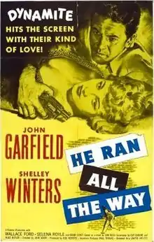 He Ran All the Way is a 1951 American crime drama and film noir directed by John Berry and starring John Garfield and Shelley Winters.[2] Distributed by United Artists, it was produced independently by Roberts Pictures, a company named for Garfield's manager and business partner, Bob Roberts, and bankrolled by Garfield.[3]