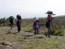 It is also wide-spread in Africa. Women in particular may have practical reasons for carrying on the head. For many African women it is "well-suited to the rough, rural terrain and the particular objects they carry—like buckets of water and bundles of firewood". The practice is usually not abandoned after migrating to urban areas where their daily routines, and socially accepted practices, are different. In Ghana, affluent residents of the southern cities employ young women who migrate from the poorer northern region to work as "head porters", called kayayei, for $2 a day.[3] In East Africa, Luo women may carry loads of up to 70% of their own body weight balanced on top of their heads. Women of the Kikuyu tribe carry similar heavy loads, but using a leather strap wrapped around their forehead and the load to secure it while it is carried. (see tumpline) This results in a permanent groove in the forehead of the women. However, there is no evidence of other harmful effects on the health of women who carry heavy loads on top of their heads. Researchers speculate that training from a young age may explain this. Up to 20% of the person's body weight can be carried with no extra exertion of energy.[4] Other researchers have shown that African and European women carrying 70% of their body weight in controlled studies used more oxygen while head-carrying, in contrast to carrying a load on their backs. The research did not support the notion that head-loading is less exerting than carrying on the back, "although there is some evidence of energy saving mechanisms for back-loading at low speed/load combinations".[5]