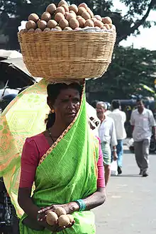 Carrying on the head is common in many parts of the developing world, as only a simple length of cloth shaped into a ring or ball is needed to carry loads approaching the person's own weight. The practice is efficient, in a place or at a time when there are no vehicles or beasts of burden available for transporting the objects. Today, women and men carry burdens on their heads where there is no less expensive, or more efficient, way of transporting workloads. In India, women carry baskets of bricks to workmen on construction sites.[1] It is also used by the lowest caste to carry away human waste scooped out of pit latrines, the practice of manual scavenging.[2]