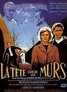 Head Against the Wall (French: La Tête contre les murs), also titled The Keepers, is a 1959 French drama film directed by Georges Franju starring Pierre Brasseur, Paul Meurisse, Jean-Pierre Mocky, Anouk Aimée, and Charles Aznavour. It was director Franju's debut feature film.[2] The story follows an aimless young man who is institutionalized for defying his wealthy father, and in the process airs several questions about how society defines and treats mental illness.