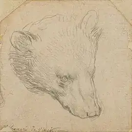Head of a Bear is thought to have been executed by a young Leonardo da Vinci (b. 1452) circa 1480. It is a close-up drawing of a bear's head on a 7-by-7-centimetre (2.8 in × 2.8 in) piece of pink-beige paper.[1][2] Its size has led it to be described as "a Post-it Note Leonardo".[1] It is drawn with a silverpoint pencil. Silverpointing is a technique that Leonardo learnt in the workshop of Andrea del Verrocchio. It is an unforgiving medium as the marks made by the silver pencil are very difficult to erase.[2]