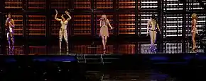 The plan of a Spice Girls' reunion was first confirmed by Mel B in June 2005.[2] She stated, "We'll get back together because we all want to. I know everyone is up for it. There is going to be a greatest hits album and we've got loads of new songs that nobody has heard yet."[2] On 28 June 2007, the group held a press conference at The O2 Arena revealing their intention to reunite.[3][4] During the conference, the group confirmed their intention to embark upon a worldwide concert tour, starting in Vancouver on 2 December 2007.[5] "I want to be a Spice Girl again. We are like sisters and we have our arguments, but by the end of the day we get back together", said Emma Bunton, while Melanie Chisholm commented that the tour "will be a proper good farewell to our fans".[6]