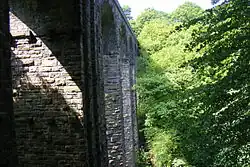 The viaduct was built from locally quarried gritstone and only a single track wide. It is 105 ft (32 m) high above the river, with eight arches, each with a 30 ft (9.1 m) span.[2]
