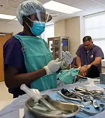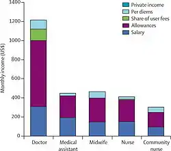 The World Health Organization and the United Nations Children's Fund were active in providing money and support to provide additional western medical care in Ghana.[5][6] They provided, "financial and technical assistance for the elimination of diseases and the improvement of health standards."[1] Traditional health practices were not recognized by these initiatives or the British Medical Department in urban areas and were shunned by Christian missionaries in rural areas. However, traditional priests, clerics, and herbalists still remained important health providers especially in rural areas where health centers were scarce.[6] After independence in 1957 Kwame Nkrumah pushed health and education policies that aimed to make these services more available and accessible; however, these policies were still mainly targeted at urban populations with 76% of doctors practicing in urban areas while only 23% of the population lived there.[5] Health programs were financed entirely through general taxation, so anyone could receive medical care in any government hospital at no cost.[7] Public Health workers would conduct inspections in workplaces to evaluate cleanliness to ensure that all citizens were living and working in environments that promoted preventative care.[7] But with free public healthcare and large government spending, Ghana found itself struggling economically. Declining world prices of its cash crops put more strain on the Ghanaian economy.[7] After Nkrumah left office in 1966, subsequent governments decided to continue to keep out of pocket fees low in addition to cutting government healthcare spending with the 1969 Hospital Fees Decree and the 1970 Hospitals Fees Act in the hopes of recovering fees and bolstering the economy.[8] Even with the cut in government spending, economic conditions continued to worsen as did healthcare services. In 1980s, many social services, including healthcare, were inadequate and could not provide sufficient care and drugs despite the fact that healthcare was virtually free.[8]